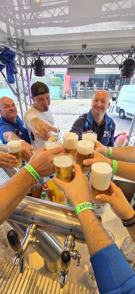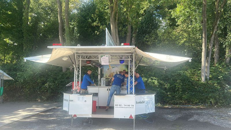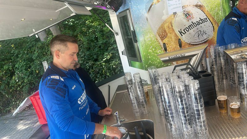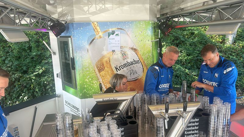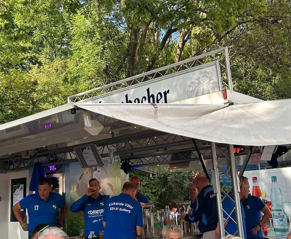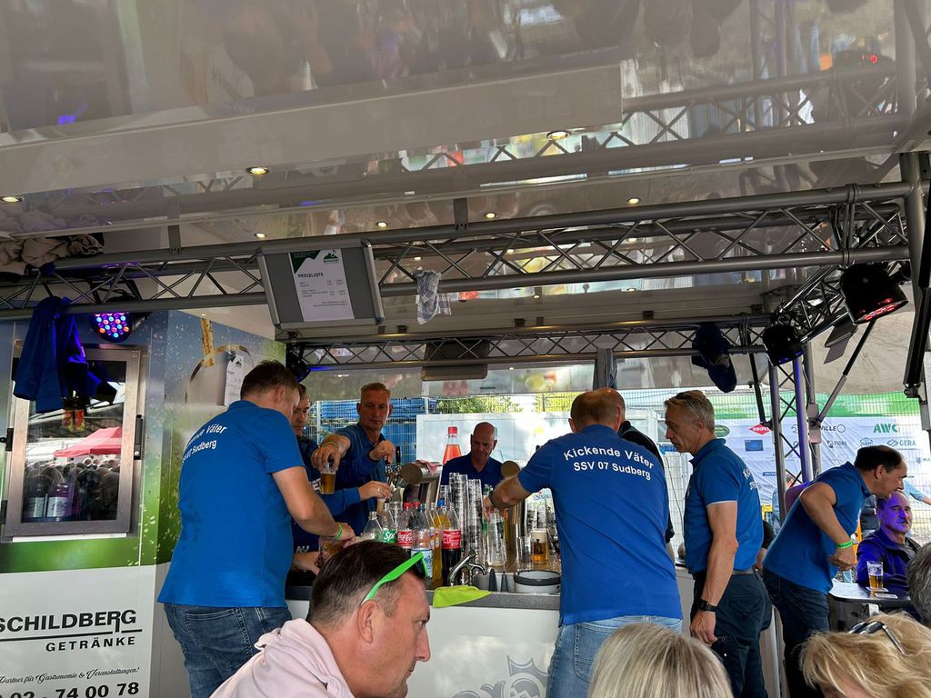 Sechs Kickende Väter empfingen ab 16 Uhr die Geburtstagsgäste im blauen KV-Polo am Getränkestand des SSV 07 Wuppertal-Sudberg, direkt neben der Bühne. Es wurde ein reichhaltiges und umfangreiches Getränkeangebot mit Wasser, Apfelschorle, Fanta, Cola, Sprite und Bier offeriert. Doch bevor es losging, galt es rund 1.000 Getränkebecher zu spülen, damit die Getränke noch besser schmeckten.